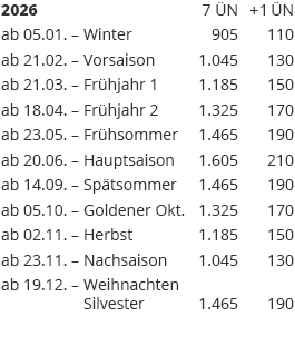 Saisonzeiten und Preise bei Belegung mit 2 Gästen