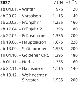 Saisonzeiten und Preise bei Belegung mit 2 Gästen